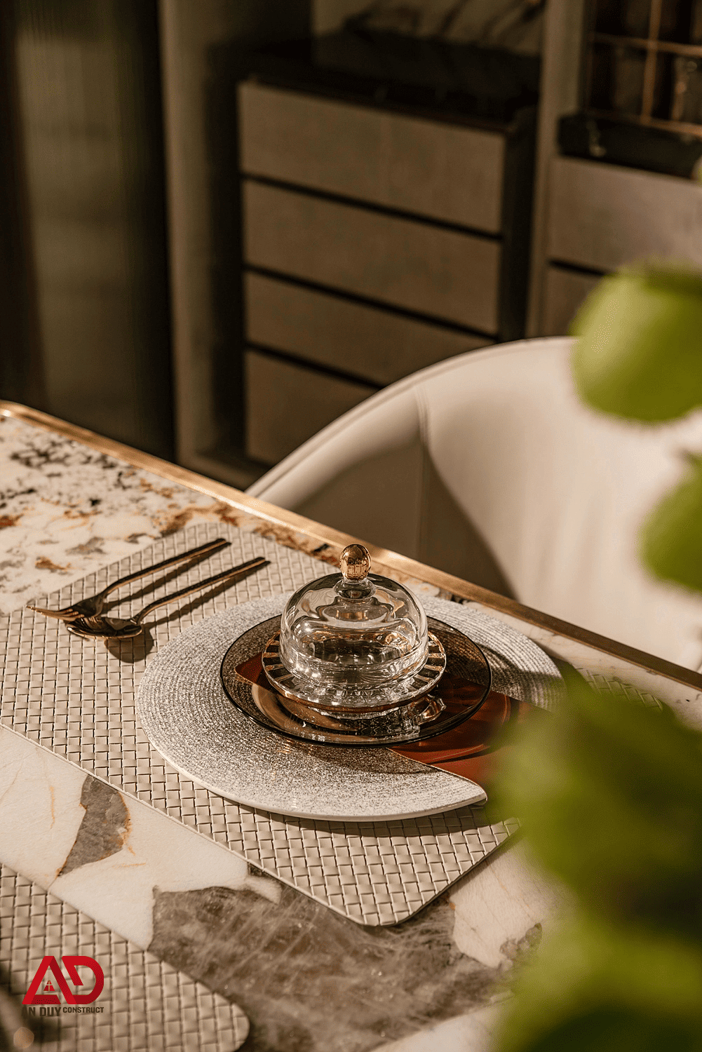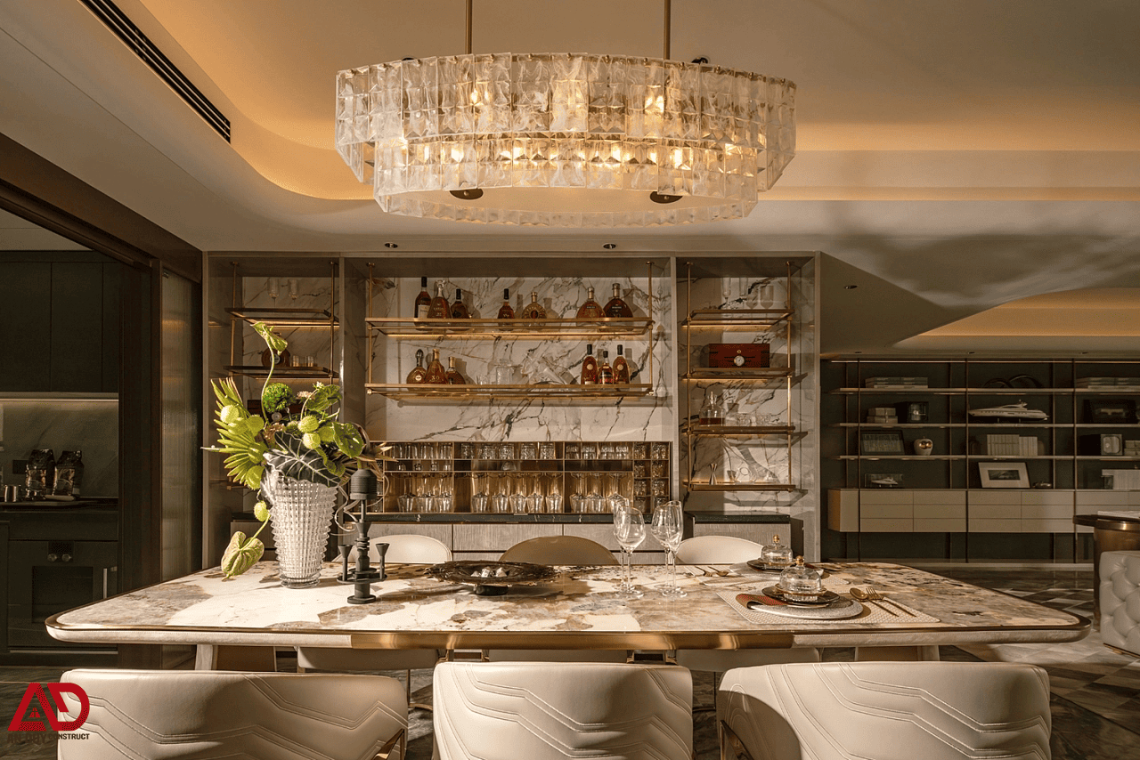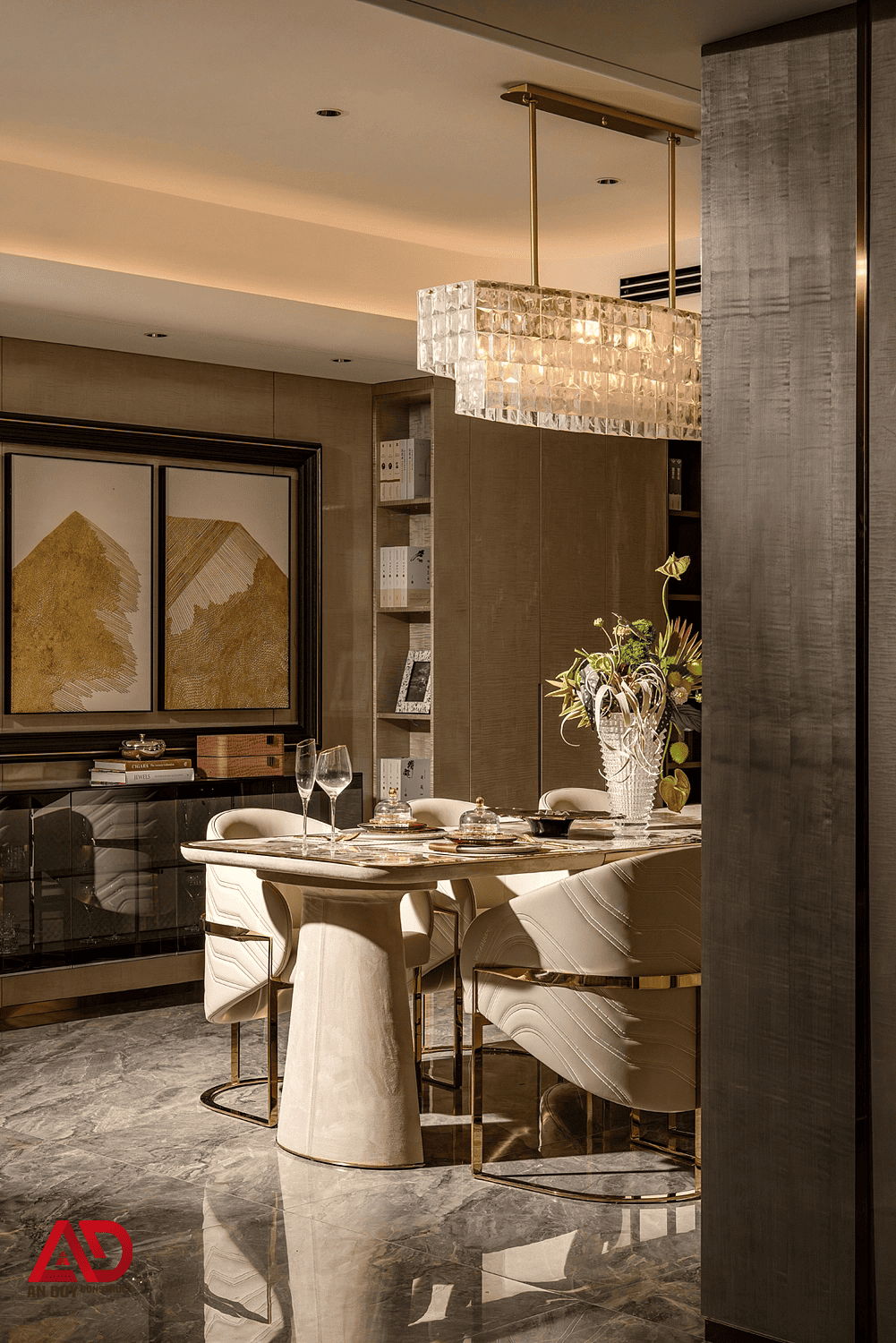 Không gian bàn ăn được An Duy Construct xử lý như một điểm nhấn nghệ thuật của căn hộ. Bàn ăn mặt đá với đường vân độc bản kết hợp ghế bọc da sáng màu, chân kim loại ánh vàng tạo nên một tổng thể sang trọng, thời thượng. Đèn thả trần phía trên bàn ăn có thiết kế tinh xảo, góp phần nâng tầm trải nghiệm thị giác và cảm xúc cho mỗi bữa ăn.