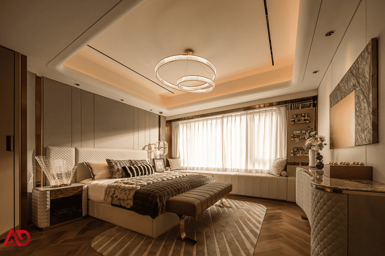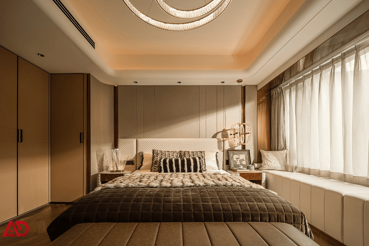 Trong thiết kế phòng ngủ chung cư, yếu tố quan trọng nhất là cảm giác thư giãn. Ở dự án này, phòng ngủ master được hoàn thiện với ngôn ngữ mềm mại, ấm áp và rất sang. Giường ngủ lớn với phần đầu giường bọc nệm tạo cảm giác êm ái, trong khi hệ đèn thả đối xứng hai bên giúp không gian trở nên cân bằng và tinh tế hơn.