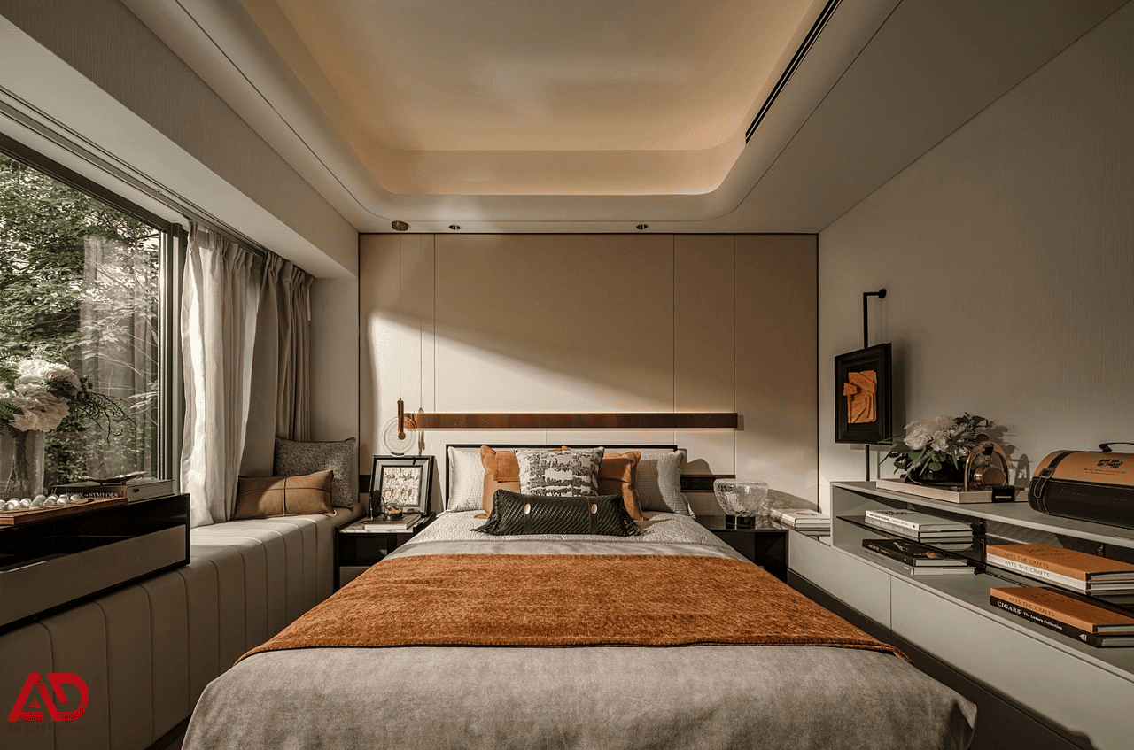 Khu vực tủ, tab đầu giường, băng ghế cuối giường và hệ tủ console được thiết kế đồng bộ về vật liệu và màu sắc. Ánh sáng gián tiếp chạy quanh trần tạo cảm giác nhẹ nhàng, dễ chịu, rất phù hợp với nhịp sống đô thị cần một nơi nghỉ ngơi thực sự chất lượng sau ngày dài làm việc.