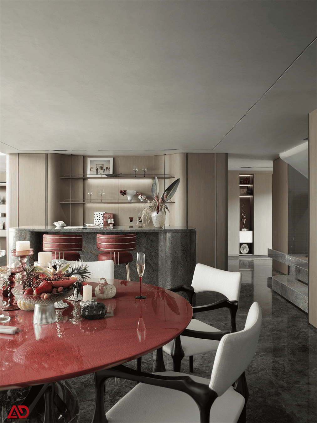 Bên cạnh bàn ăn, khu bar nhỏ và góc làm việc cũng là những chi tiết đáng chú ý. Quầy bar bọc đá vân đậm kết hợp ghế bar tông đỏ giúp tăng cảm giác sang trọng, đồng thời kết nối tốt với bảng màu chung của căn hộ. Hệ kệ mở phía sau vừa mang tính trưng bày, vừa hỗ trợ công năng tiếp khách.