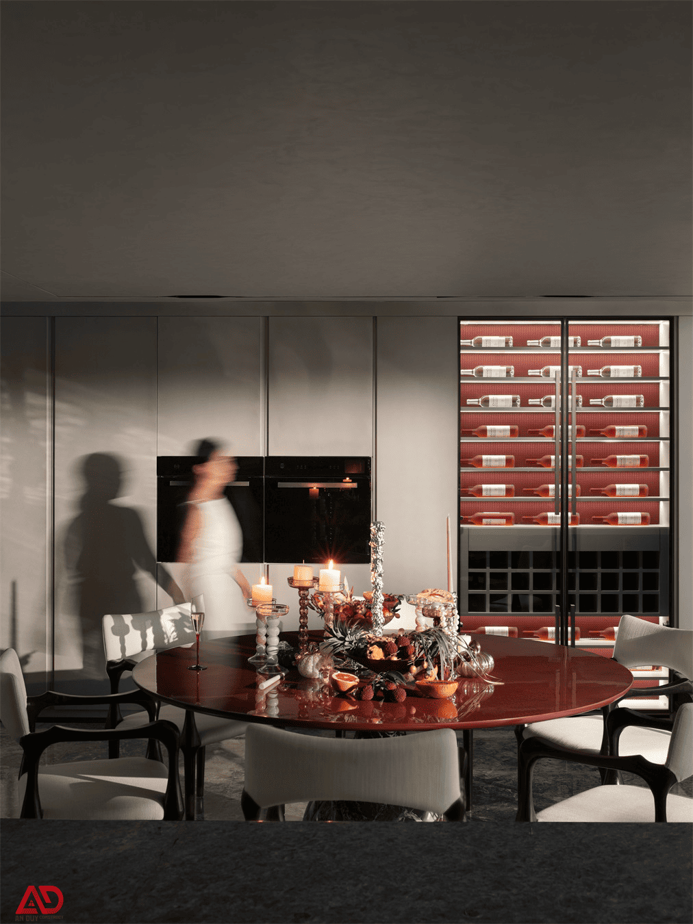 Điểm nhấn đắt giá trong khu vực này là hệ tủ rượu âm tường chiếu sáng, vừa làm tăng giá trị thẩm mỹ vừa tạo nên dấu ấn cá nhân cho gia chủ. Ngoài ra, cách bày trí nến, trái cây, ly uống rượu và phụ kiện trang trí giúp bàn ăn trở nên sống động, mang tinh thần của một không gian sống thực thụ chứ không đơn thuần là khu chức năng.