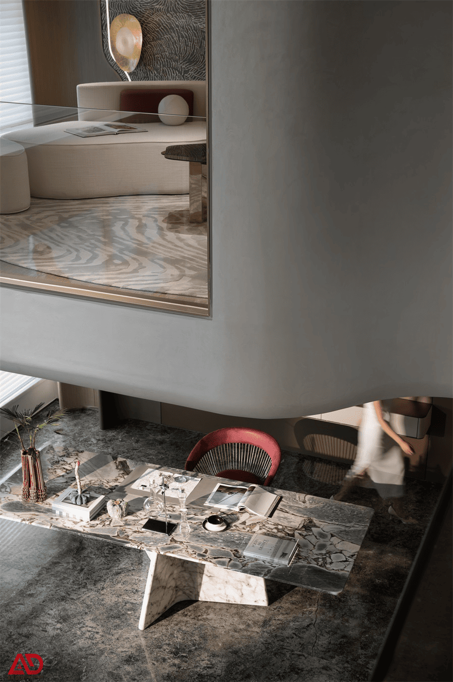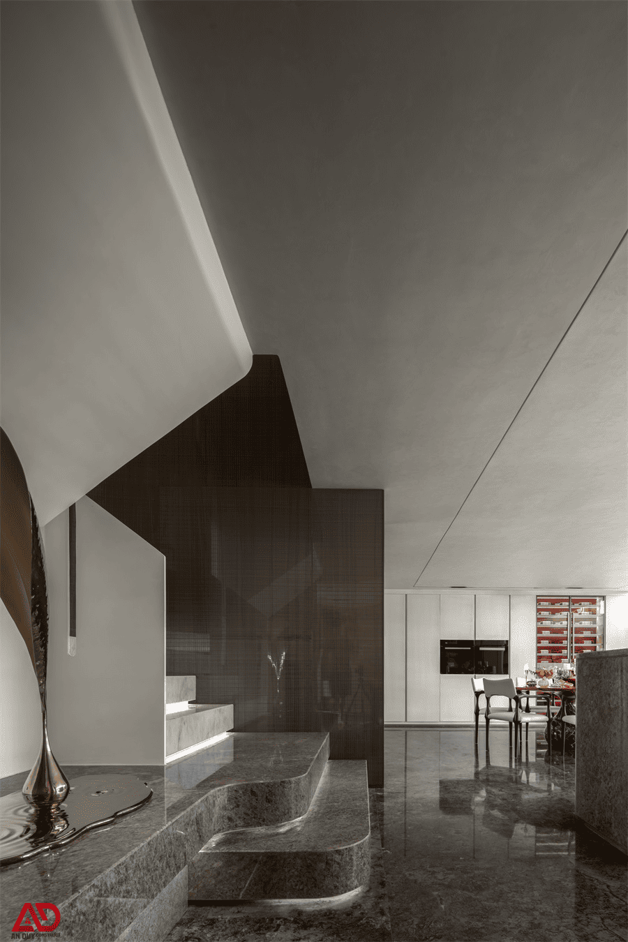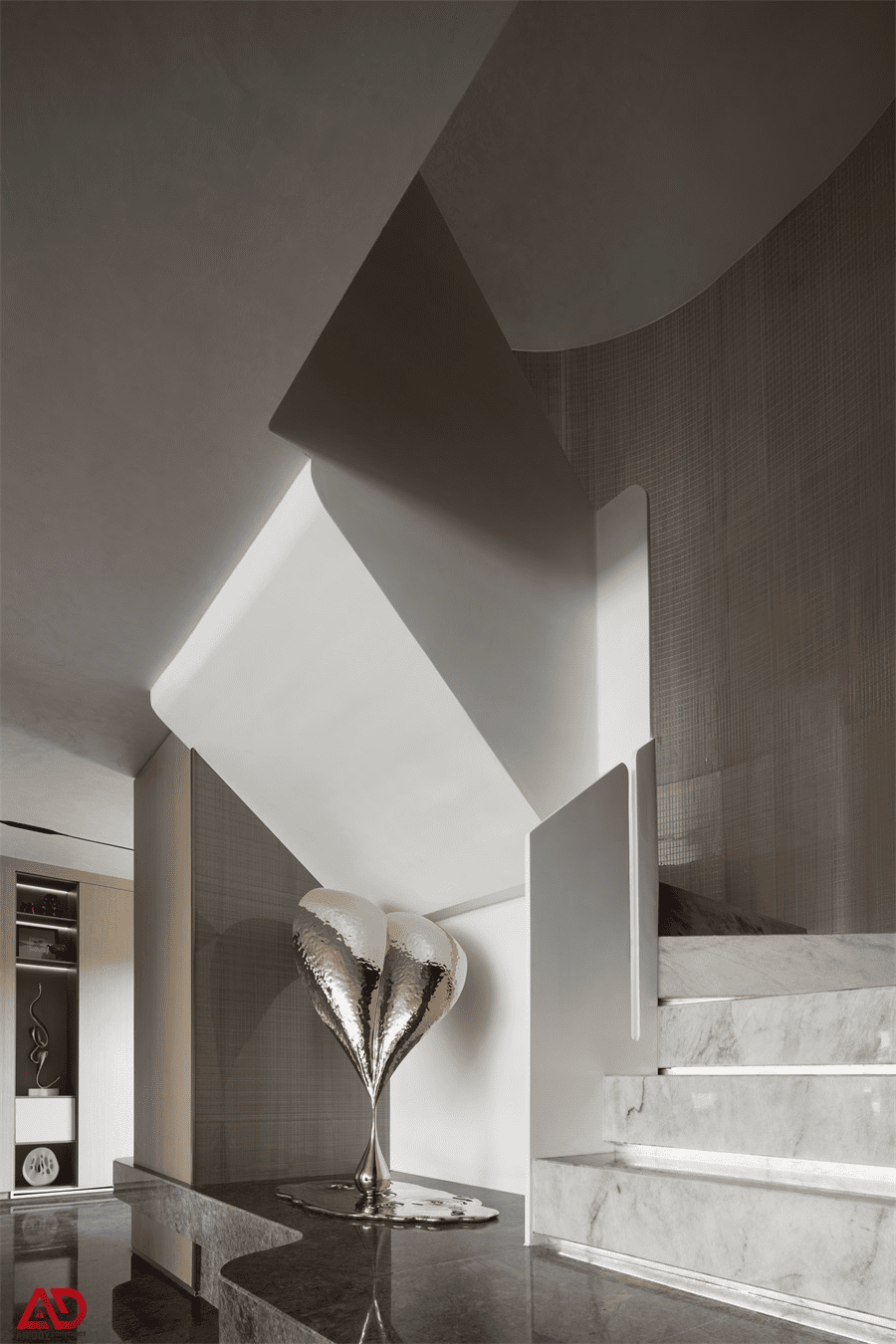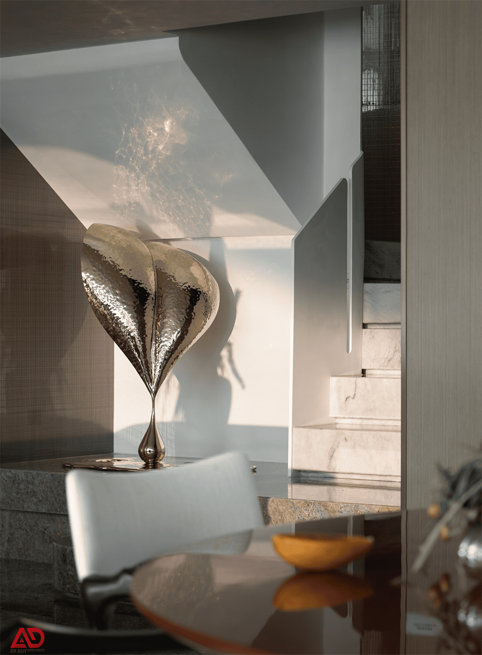 Phần cầu thang trong dự án được xử lý như một chi tiết điêu khắc. Bậc thang đá sáng màu kết hợp cùng vách trắng bo mềm và nền đá tối màu tạo ra sự đối lập rất sang. Sự xuất hiện của vật phẩm trang trí ánh kim gần khu vực chân thang càng làm tăng cảm giác nghệ thuật cho không gian.