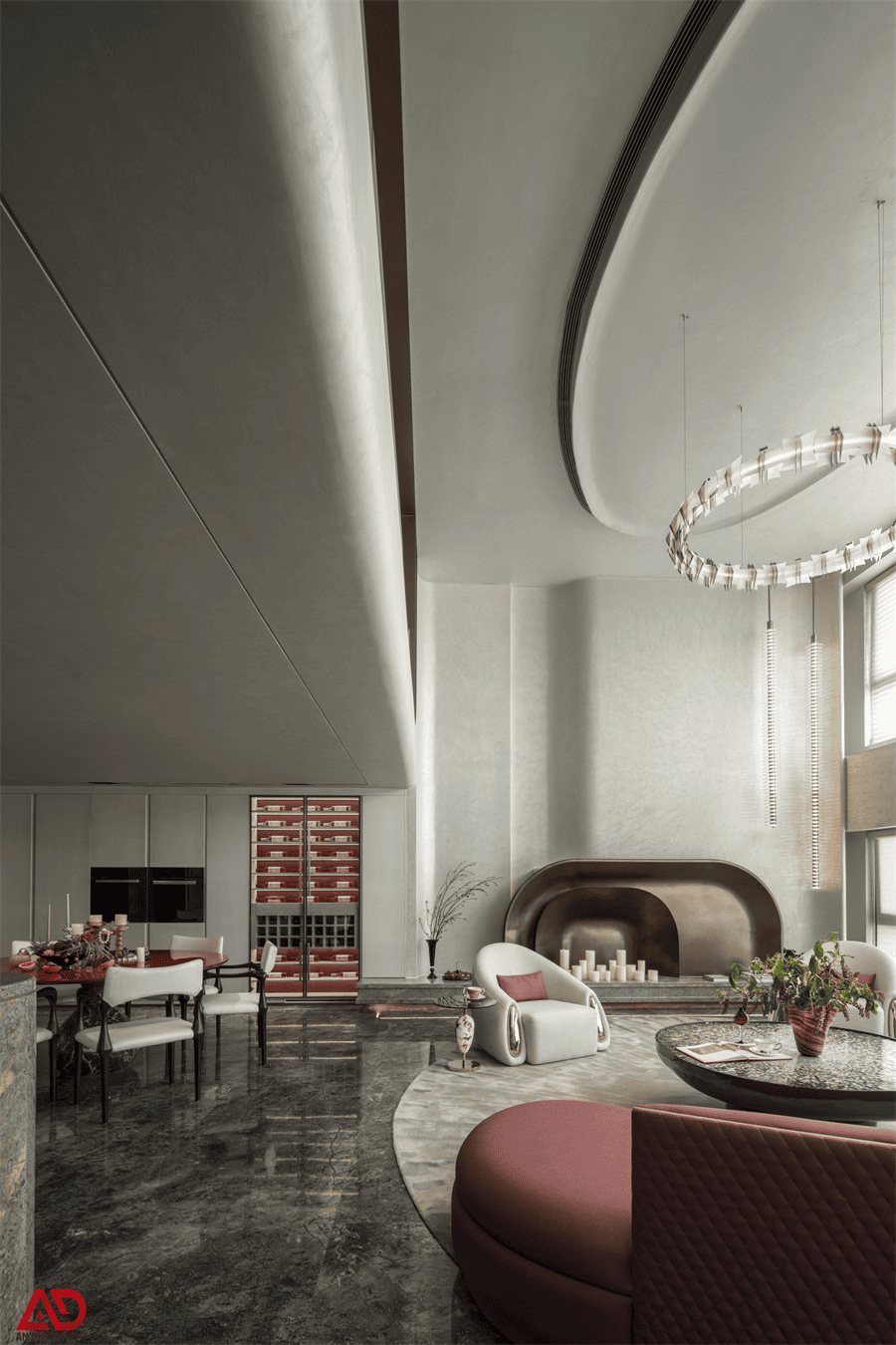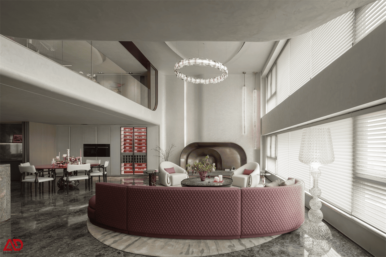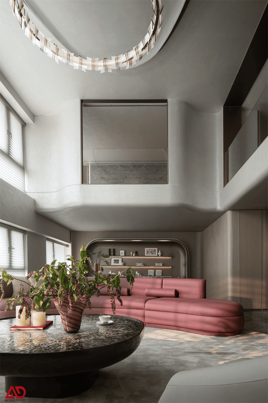 Ngay từ cái nhìn đầu tiên, công trình gây ấn tượng bởi không gian phòng khách thông tầng với chiều cao lớn, ánh sáng tự nhiên dồi dào và các mảng cong mềm mại đầy tính điêu khắc. Bên cạnh đó, sự kết hợp giữa sofa sắc hồng rượu vang, đá vân đậm, ánh kim, kính và các chi tiết bo tròn đã tạo nên một không gian sống có chiều sâu thị giác mạnh mẽ nhưng vẫn giữ được sự thanh lịch.