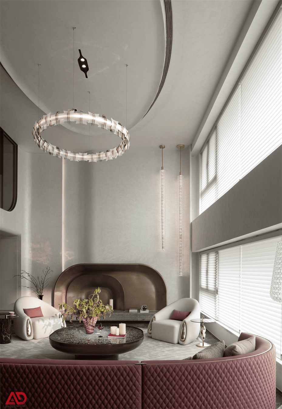 Một trong những yếu tố làm nên giá trị riêng của dự án là cách xử lý hình khối. Thay vì sử dụng quá nhiều đường thẳng cứng, công trình khai thác mạnh các đường cong ở trần, vách, sofa, kệ trang trí và khu lò sưởi giả trang trí. Chính điều này tạo nên cảm giác mềm mại, liền mạch và giàu tính nghệ thuật.