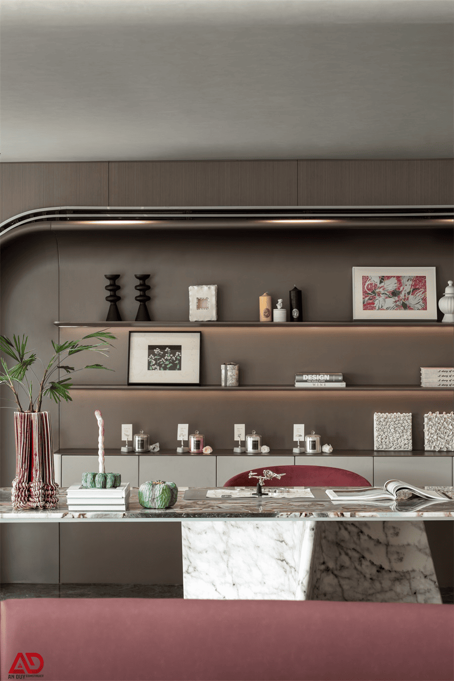 Bảng màu của công trình cũng được chọn lọc rất kỹ. Nền xám sáng, trắng kem và nâu trung tính đóng vai trò chủ đạo, trong khi các sắc đỏ rượu vang, ánh kim và đá vân đậm tạo nên chiều sâu sang trọng. Sự phối hợp này giúp không gian có cá tính rất riêng nhưng vẫn giữ được độ thanh lịch cần thiết cho một căn hộ cao cấp.