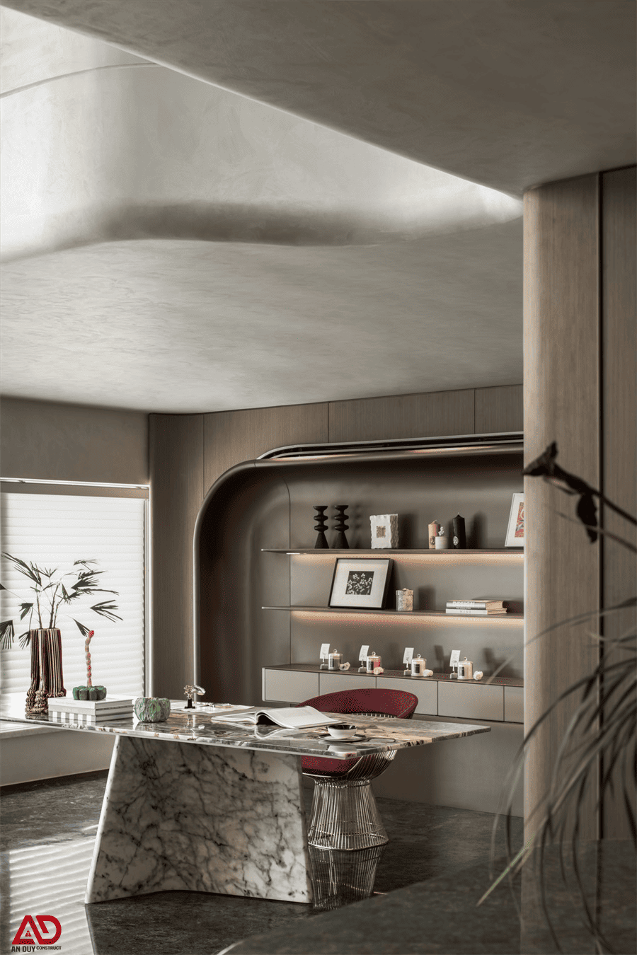 Ngoài ra, góc bàn làm việc với mặt đá và hệ kệ bo cong âm tường tạo nên một khu vực riêng tư nhưng vẫn hòa vào tổng thể mở. Đây là giải pháp thông minh cho gia chủ cần một nơi làm việc tại nhà mà vẫn muốn đảm bảo tính thẩm mỹ xuyên suốt.
