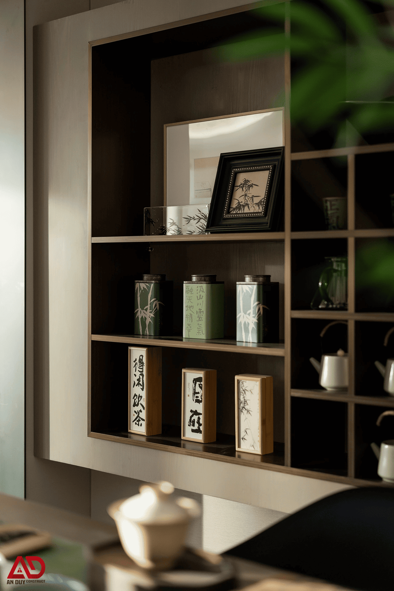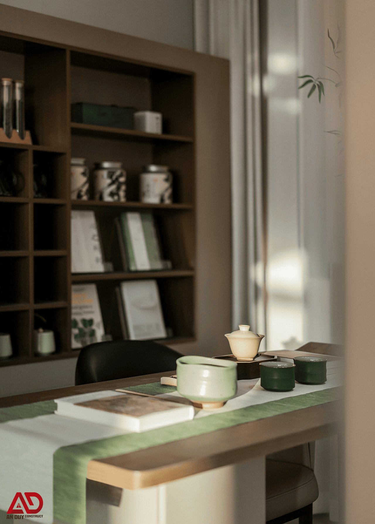 Nội thất khu vực này ưu tiên vật liệu gỗ, gốm và các tông màu xanh trầm, be sáng, mang đậm tinh thần tối giản Á Đông. Hệ kệ trưng bày âm tường màu gỗ đậm vừa là nơi lưu trữ vừa đóng vai trò trang trí, giúp góc trà trở nên gọn gàng nhưng giàu cảm xúc. Các chi tiết như ấm chén, bình tre, sách và vật phẩm decor được sắp đặt có chủ ý, tạo nên vẻ đẹp nhẹ nhàng, sâu lắng.