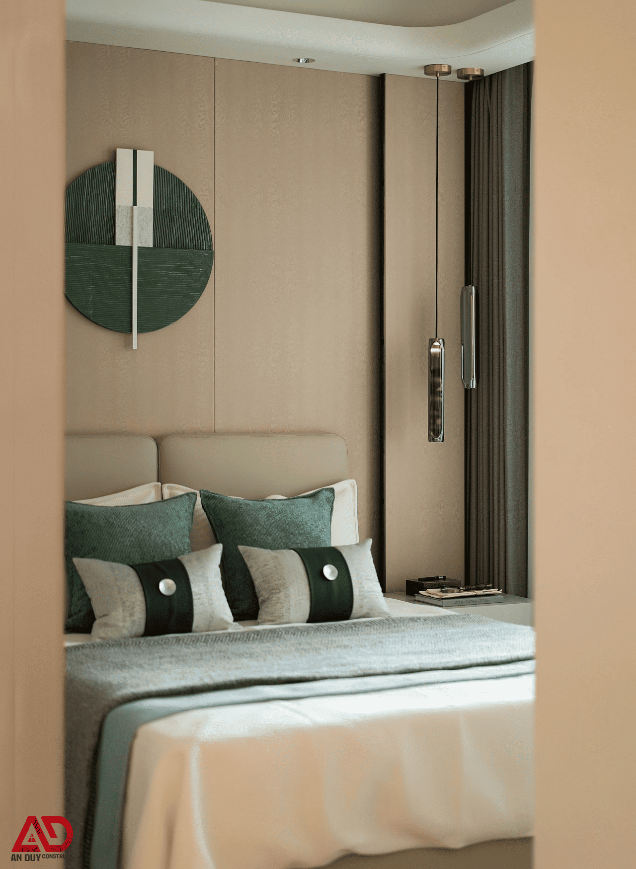 Không gian phòng ngủ của căn hộ được thiết kế theo tinh thần sang trọng, ấm áp và thư giãn. Vách đầu giường bọc nệm khổ lớn mang lại cảm giác êm ái, đồng thời tăng sự bề thế cho căn phòng. Màu sắc chủ đạo vẫn được duy trì đồng nhất với tổng thể căn hộ: kem, nâu gỗ và xanh trầm, tạo nên sự xuyên suốt về thẩm mỹ.