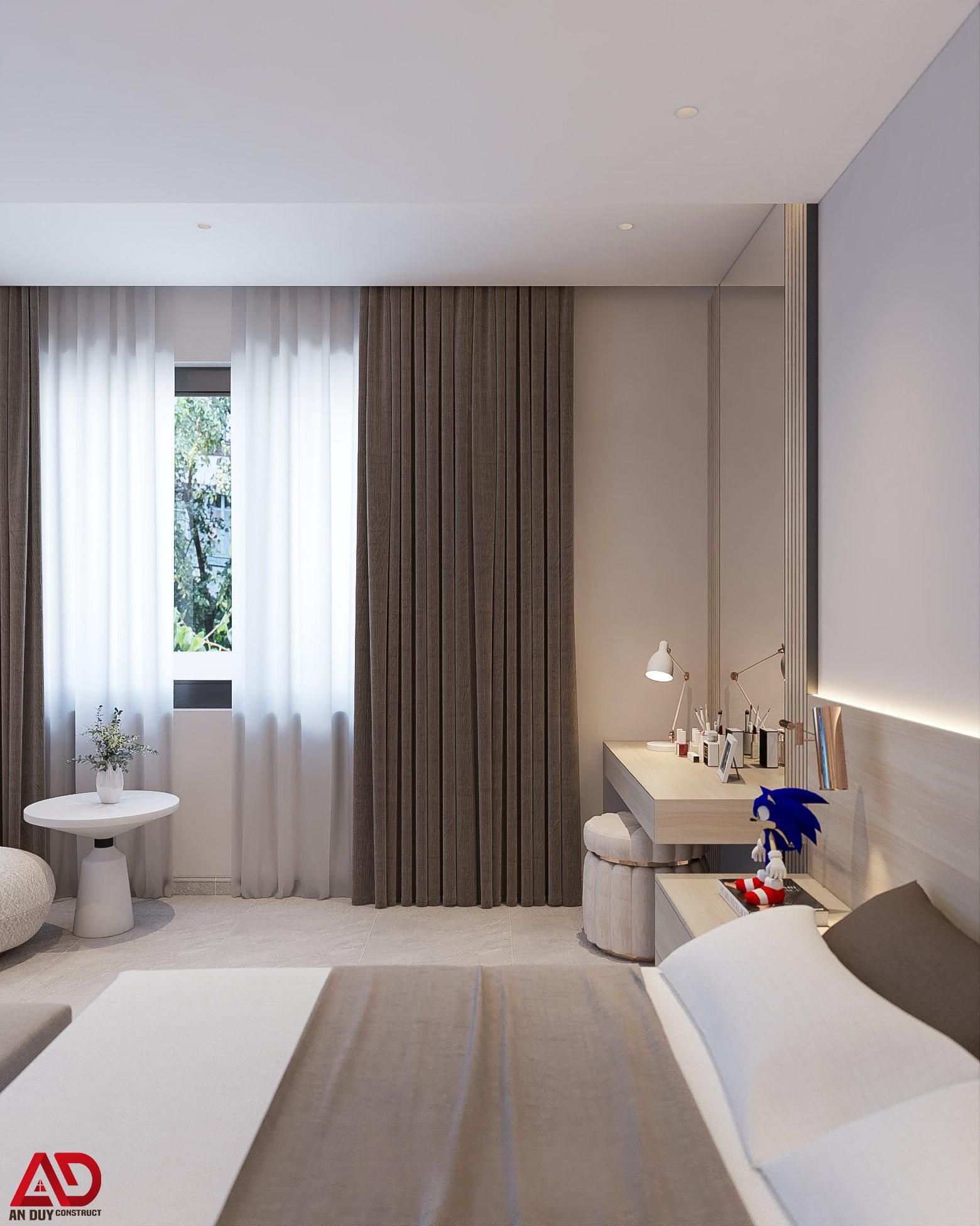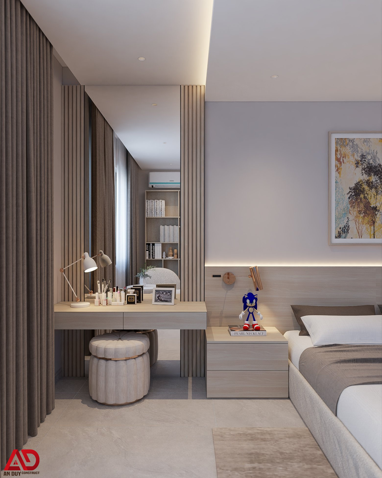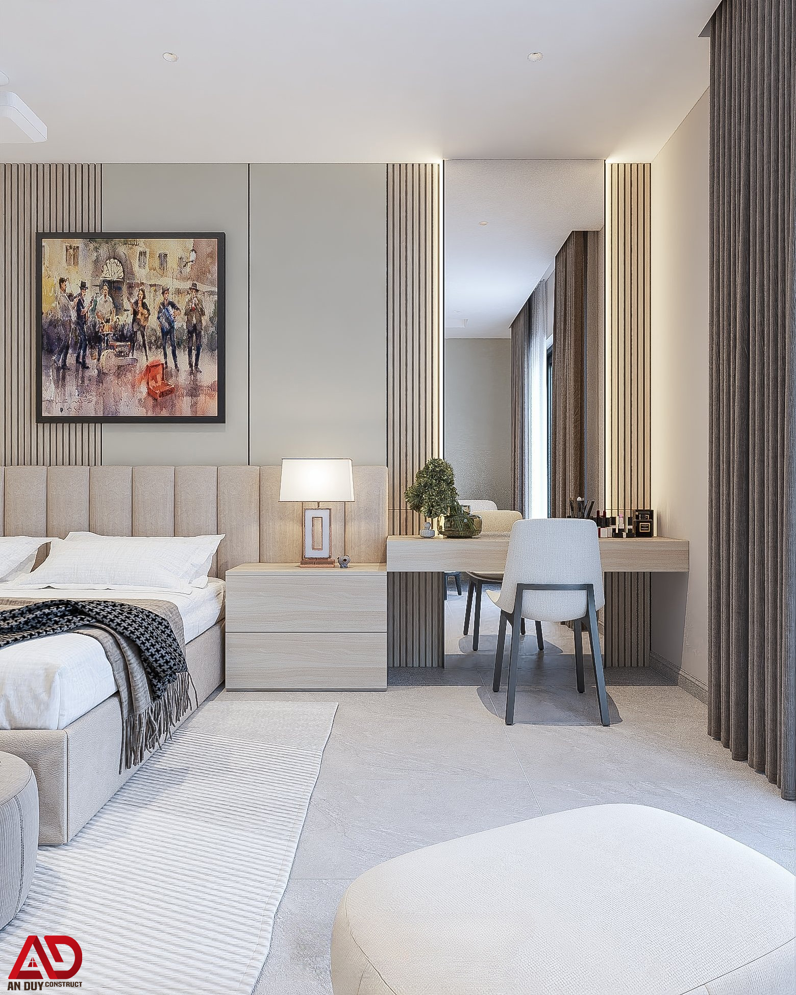 Không gian phòng ngủ được thiết kế theo tinh thần tối giản, nhẹ nhàng nhưng vẫn sang trọng. Giường ngủ bọc nệm màu sáng kết hợp tab đầu giường và bàn trang điểm đồng bộ mang lại cảm giác thư thái, dễ chịu.