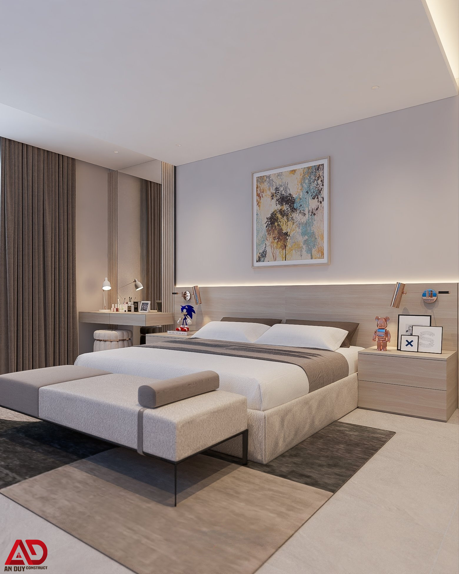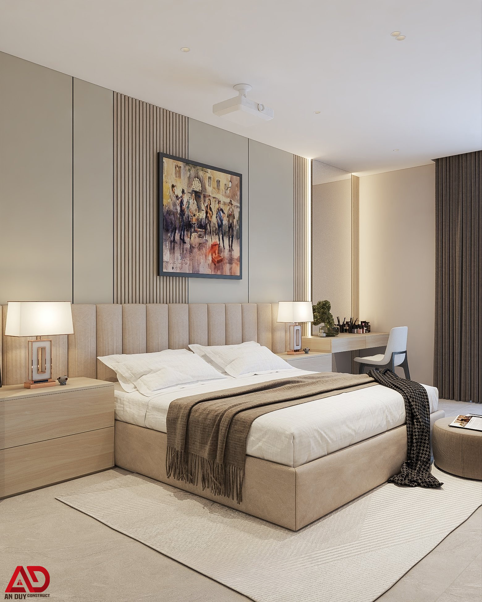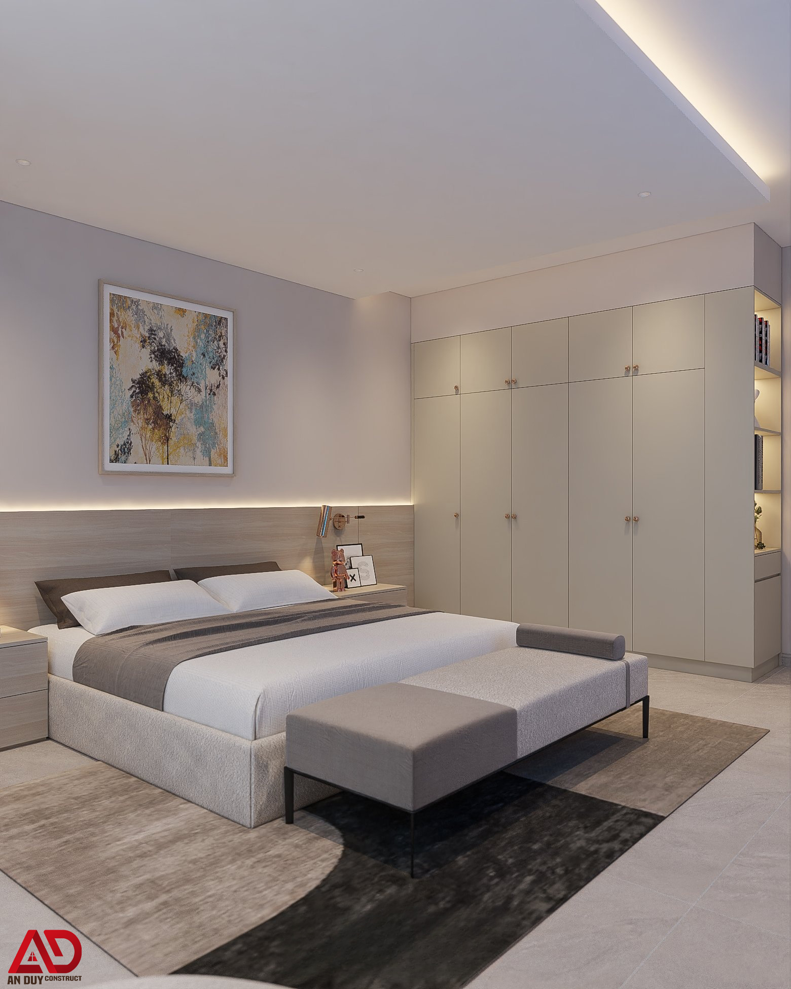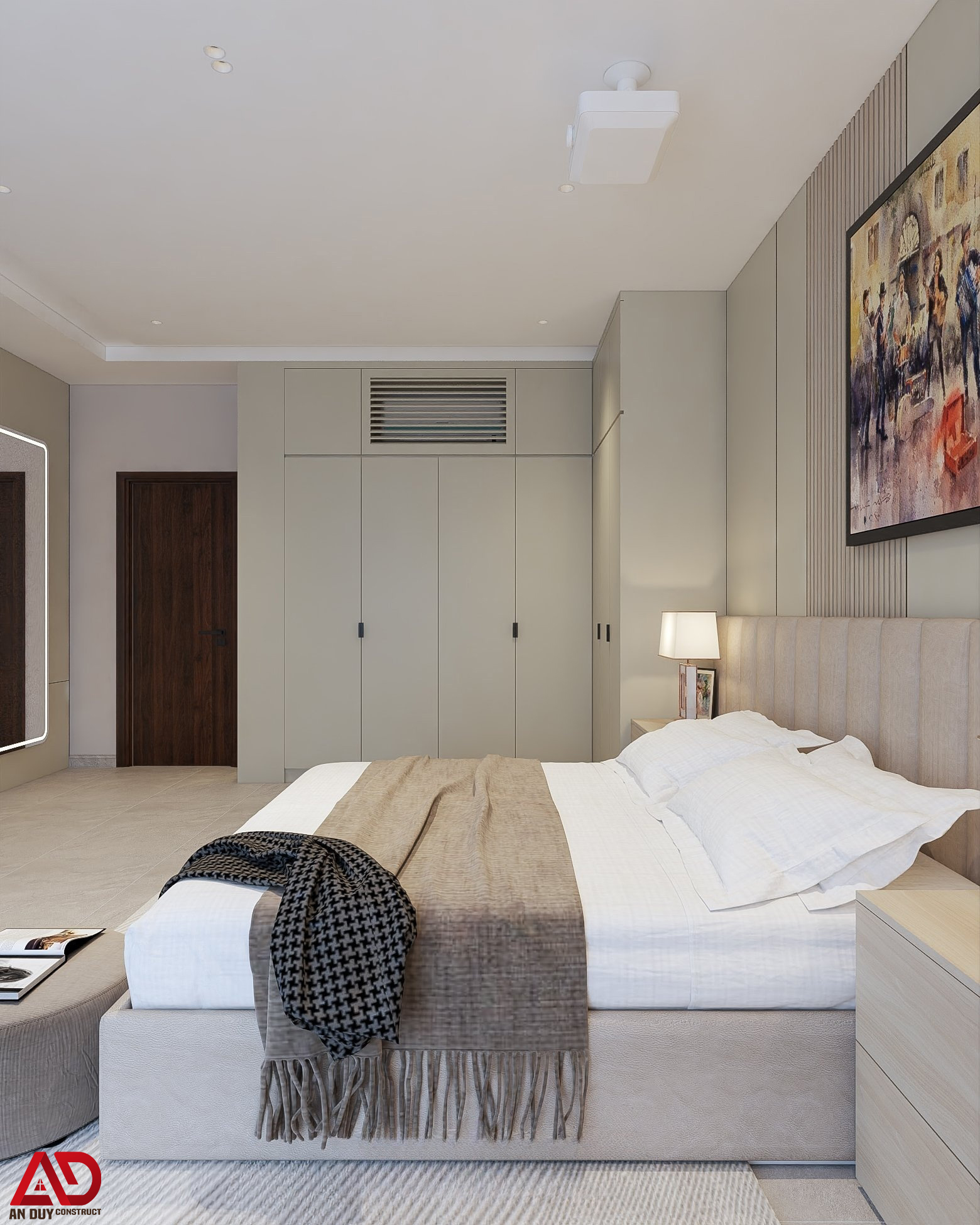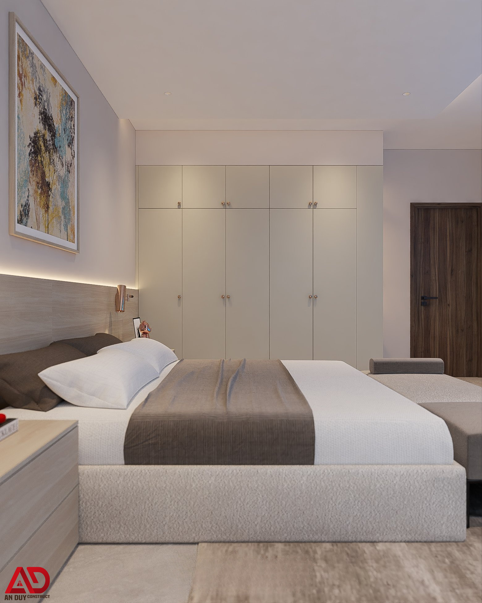Điểm nổi bật là hệ đầu giường kéo dài tích hợp ánh sáng led hắt nhẹ, kết hợp tranh treo tường nghệ thuật để tăng chiều sâu thị giác. Tủ áo âm tường thiết kế phẳng, gọn giúp tối ưu diện tích sử dụng và giữ cho căn phòng luôn ngăn nắp.