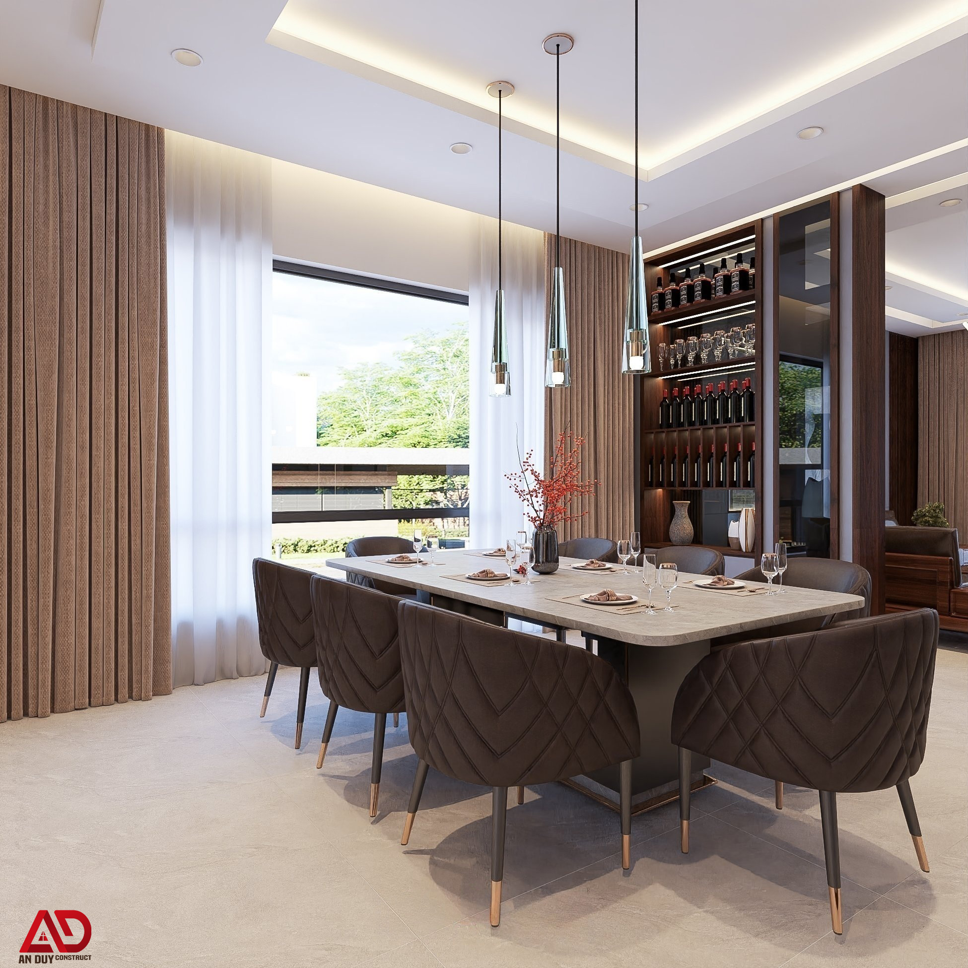 Hệ tủ trang trí kiêm tủ rượu được bố trí sát khu vực bàn ăn vừa tăng giá trị thẩm mỹ, vừa nâng cao công năng sử dụng. Ánh sáng tự nhiên từ hệ cửa kính lớn kết hợp rèm hai lớp giúp không gian luôn thông thoáng, sáng dịu và dễ chịu trong suốt cả ngày.
