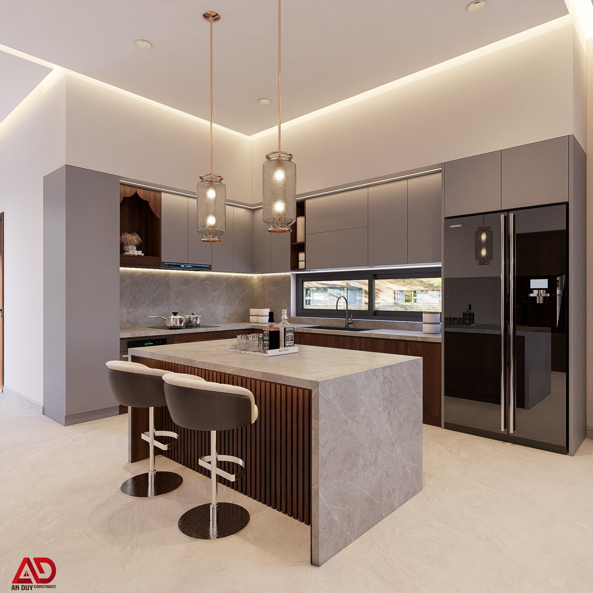 Khu vực bếp được xử lý theo phong cách tối giản hiện đại với hệ tủ bếp chữ L kết hợp đảo bếp trung tâm. Tông màu ghi sáng phối cùng gỗ nâu trầm tạo nên tổng thể sang trọng, sạch sẽ và hợp xu hướng.