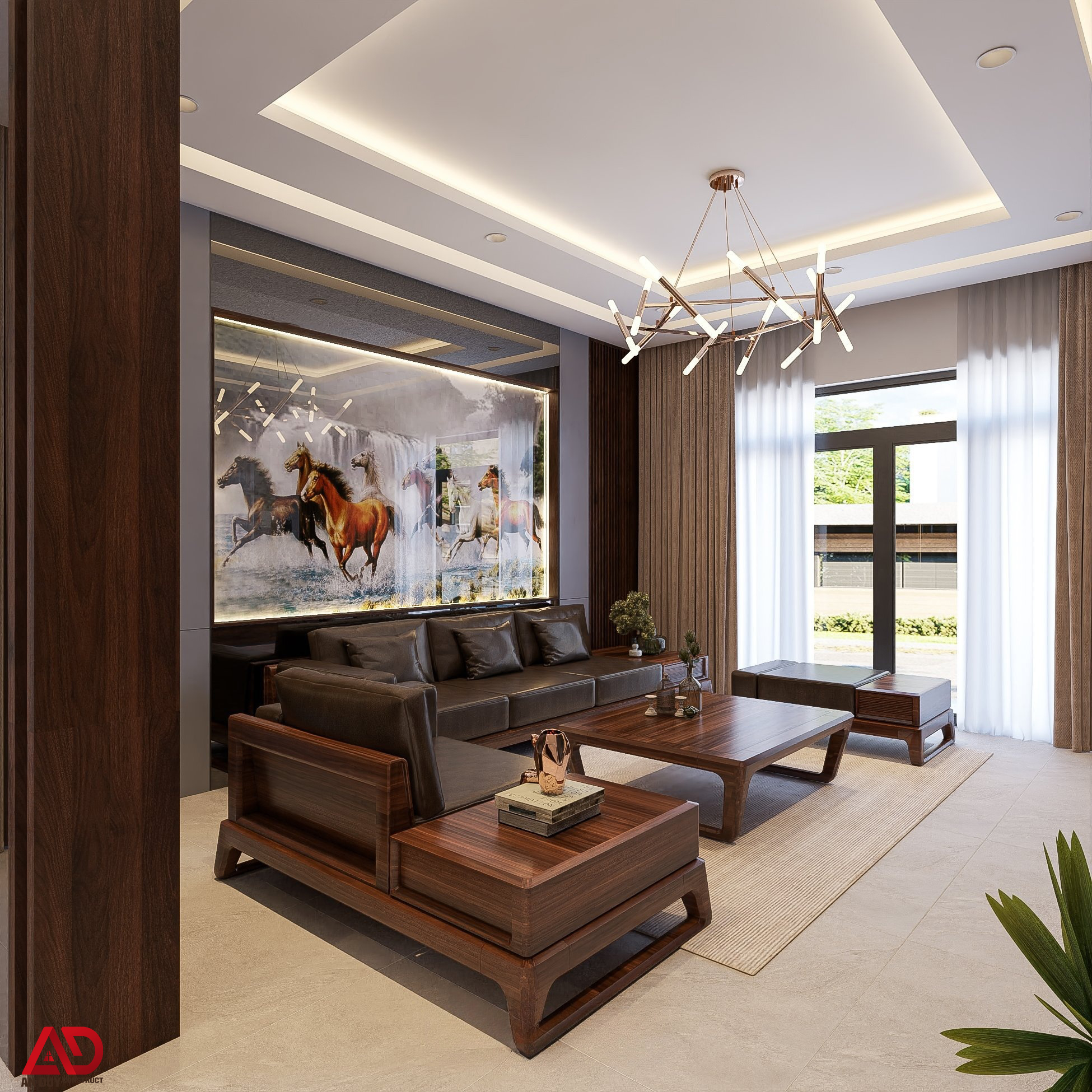 Không gian phòng khách là điểm nhấn nổi bật của toàn bộ ngôi nhà. Bộ sofa gỗ kết hợp đệm da màu nâu đậm mang lại cảm giác bề thế, sang trọng nhưng vẫn gần gũi. Bàn trà gỗ mặt rộng với thiết kế chân cách điệu giúp tổng thể thêm mềm mại và tinh tế.