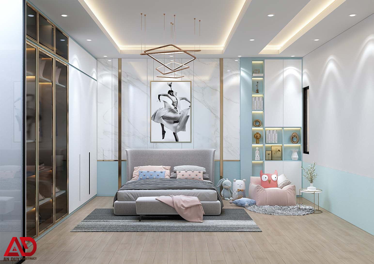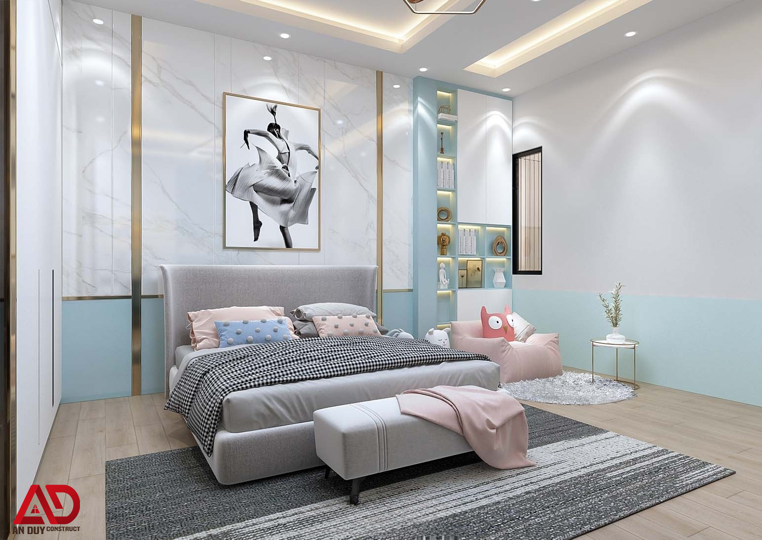 Không gian phòng ngủ trẻ em sử dụng tông màu pastel xanh nhạt kết hợp hồng phấn, tạo nên cảm giác dễ thương nhưng vẫn hiện đại. Cách phối màu này vừa phù hợp với trẻ nhỏ, vừa giúp căn phòng trông sáng và mềm mại hơn.