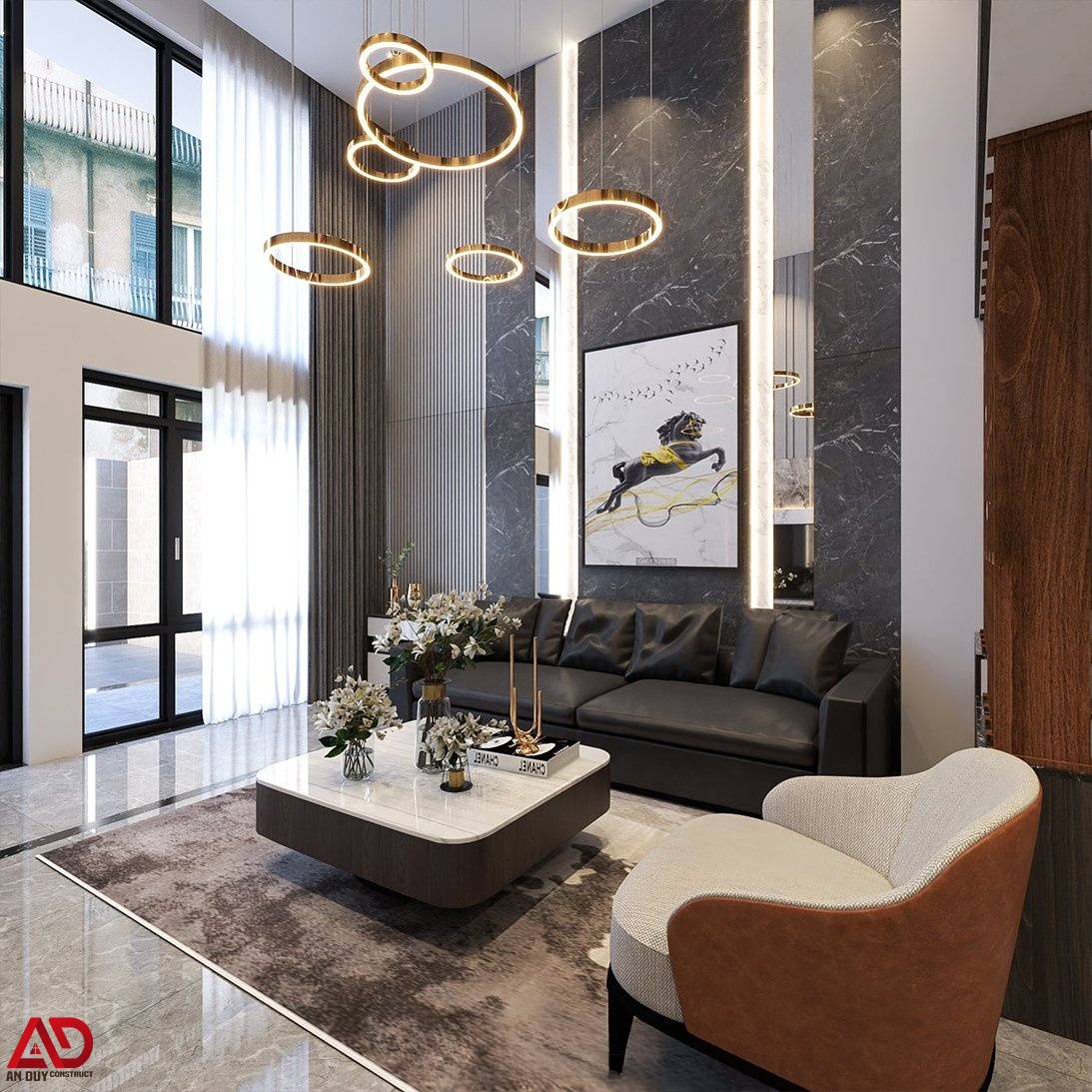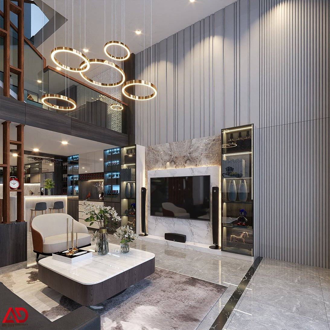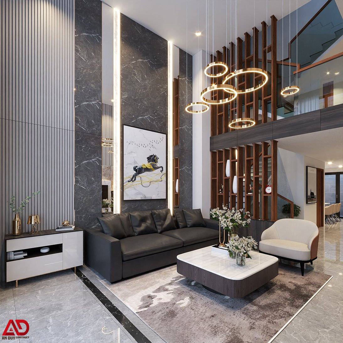 Vách tường ốp đá vân mây cao cấp kết hợp đèn LED âm dọc tạo hiệu ứng thị giác mạnh mẽ, nâng tầm không gian tiếp khách. Đặc biệt, cụm đèn thả trần hình vòng tròn ánh kim trở thành điểm nhấn nghệ thuật nổi bật, giúp toàn bộ phòng khách mang đậm tinh thần modern luxury.