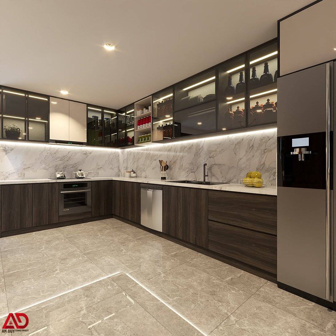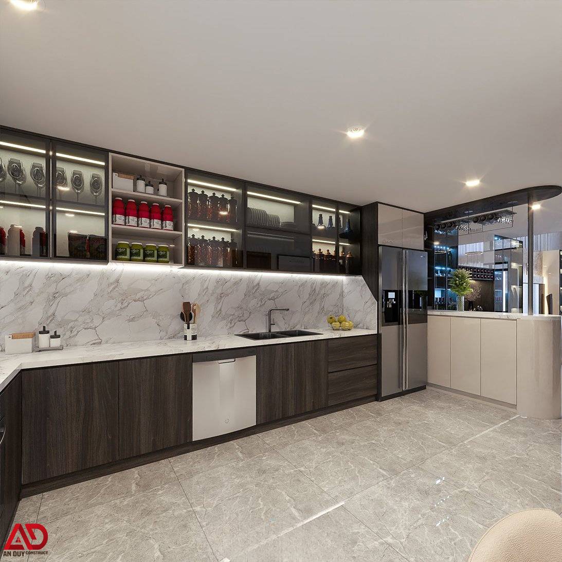 Phần tường bếp và mặt bếp đồng bộ vật liệu đá vân mây, tạo cảm giác liền mạch và dễ vệ sinh. Hệ đèn LED dưới tủ vừa tăng hiệu quả chiếu sáng, vừa làm nổi bật vẻ đẹp của vật liệu hoàn thiện. Không gian lưu trữ được bố trí khoa học, kết hợp đảo bar nhỏ và khu trưng bày rượu hiện đại, đáp ứng tốt nhu cầu sinh hoạt cũng như tiếp đãi khách.