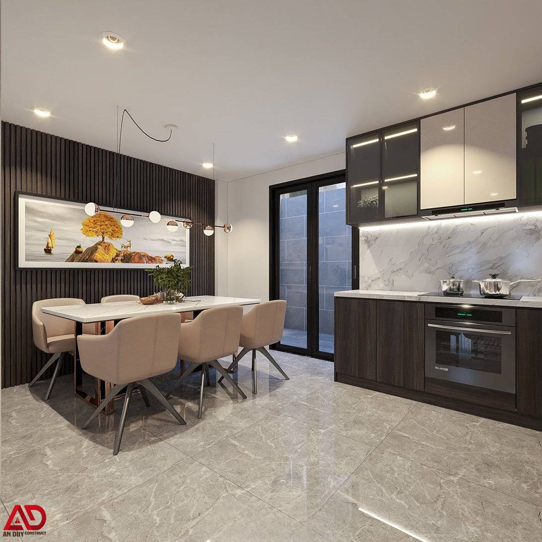 Thiết kế này không chỉ giúp không gian thêm sang trọng mà còn tạo sự liên kết mạch lạc giữa khu tiếp khách và khu bếp phía sau. Những đường nét thẳng, gọn cùng bảng màu đồng bộ giúp công trình giữ được vẻ đẹp hiện đại, không rối mắt nhưng vẫn đầy chiều sâu.