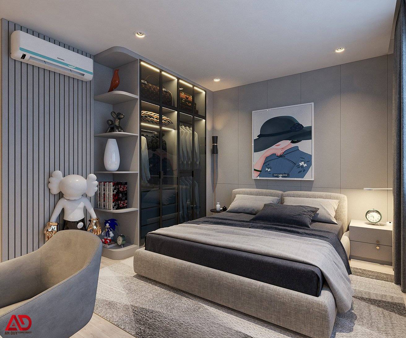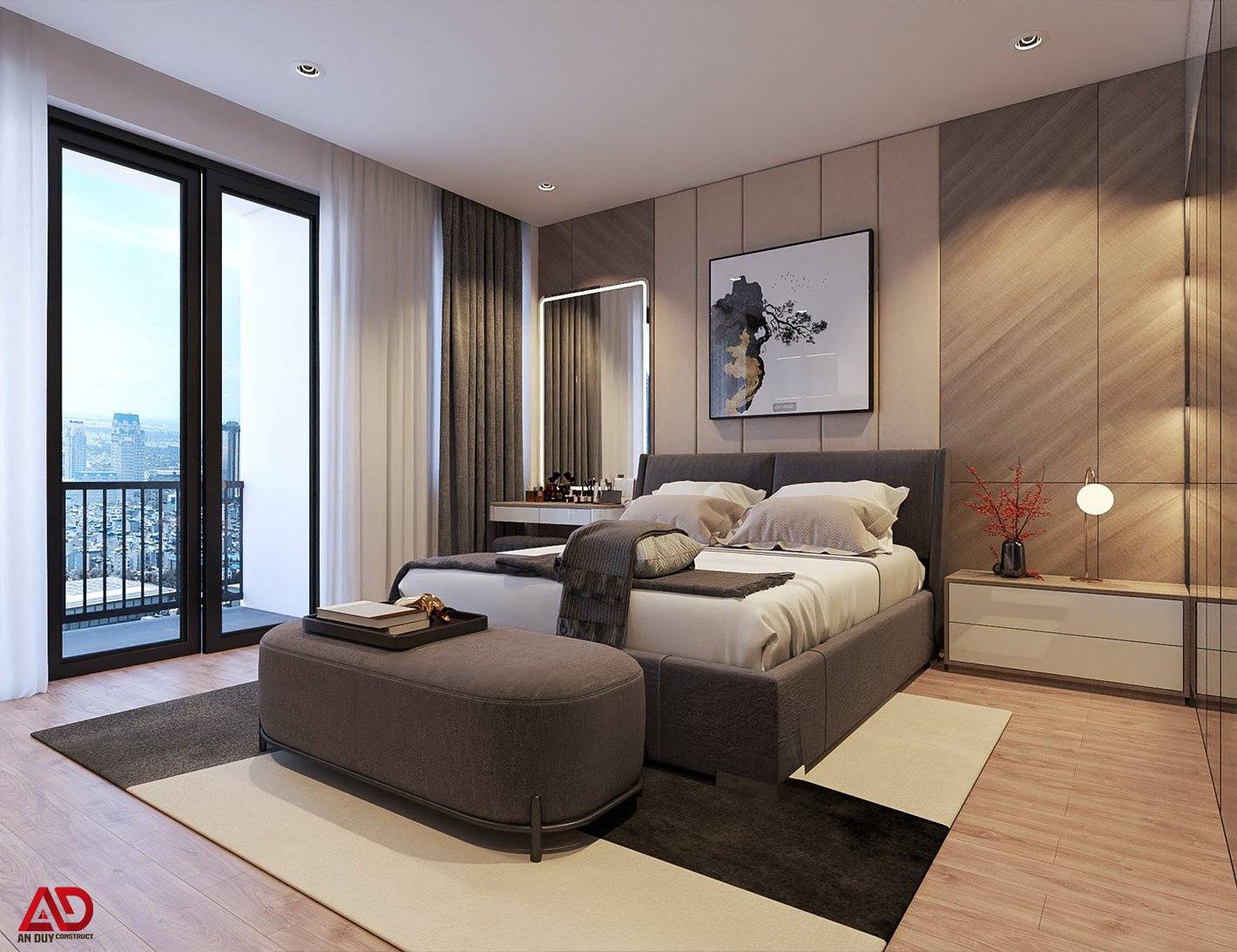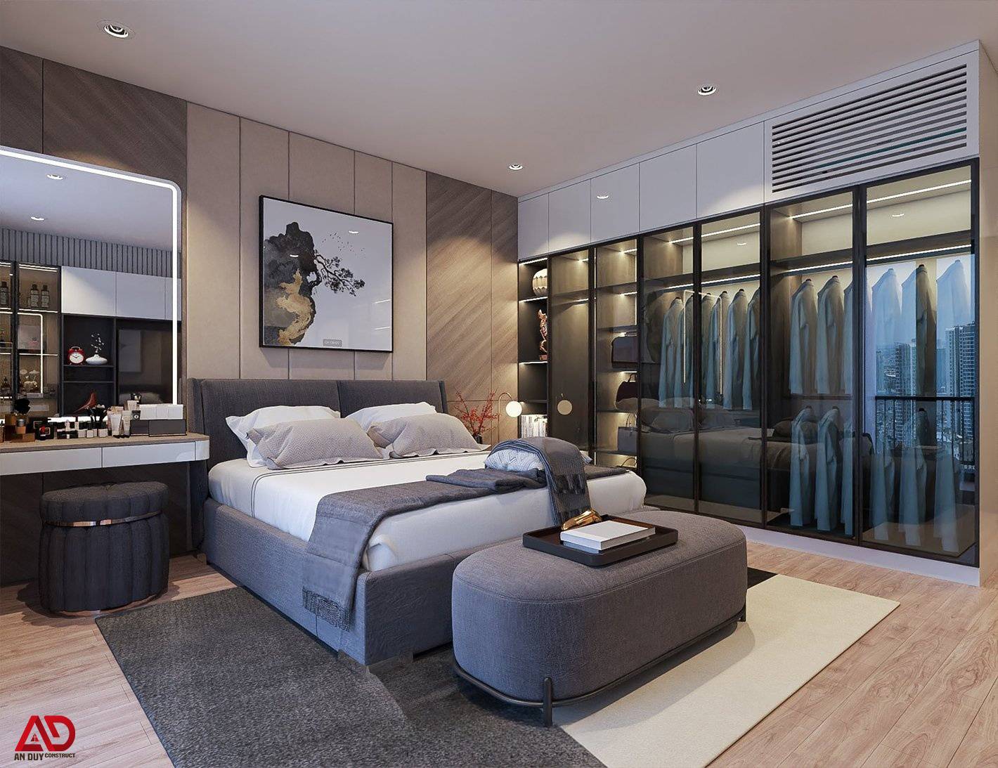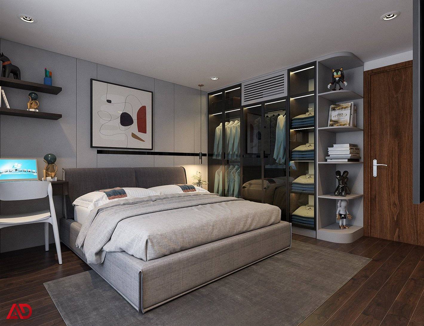 Phòng ngủ master được thiết kế với tiêu chí thư giãn và riêng tư. Gam màu be, xám và nâu gỗ được phối hợp khéo léo để tạo cảm giác ấm áp nhưng không nặng nề. Giường ngủ bọc nệm mềm mại, tab đầu giường tối giản, bàn trang điểm tích hợp gương đèn LED và hệ tủ áo cánh kính giúp không gian vừa sang vừa tiện nghi.