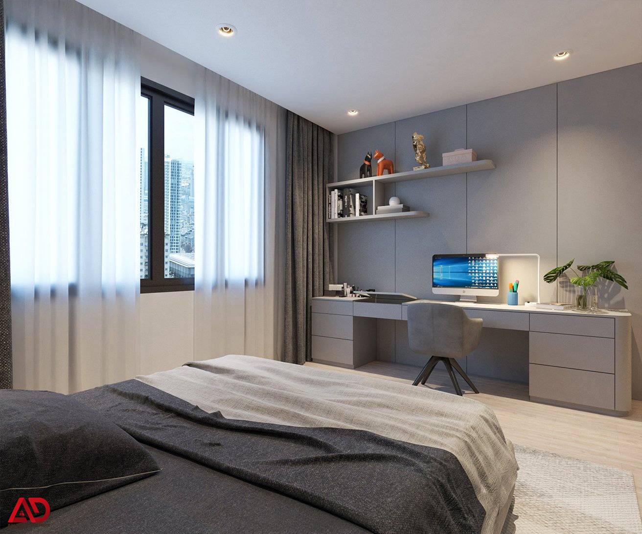 Phòng ngủ phụ vẫn giữ tinh thần thiết kế chung của toàn bộ công trình, với ngôn ngữ hiện đại, tối giản và chỉn chu. Giường ngủ, bàn học, tủ quần áo và kệ trang trí được tích hợp hài hòa, phù hợp cho nhu cầu nghỉ ngơi và học tập.