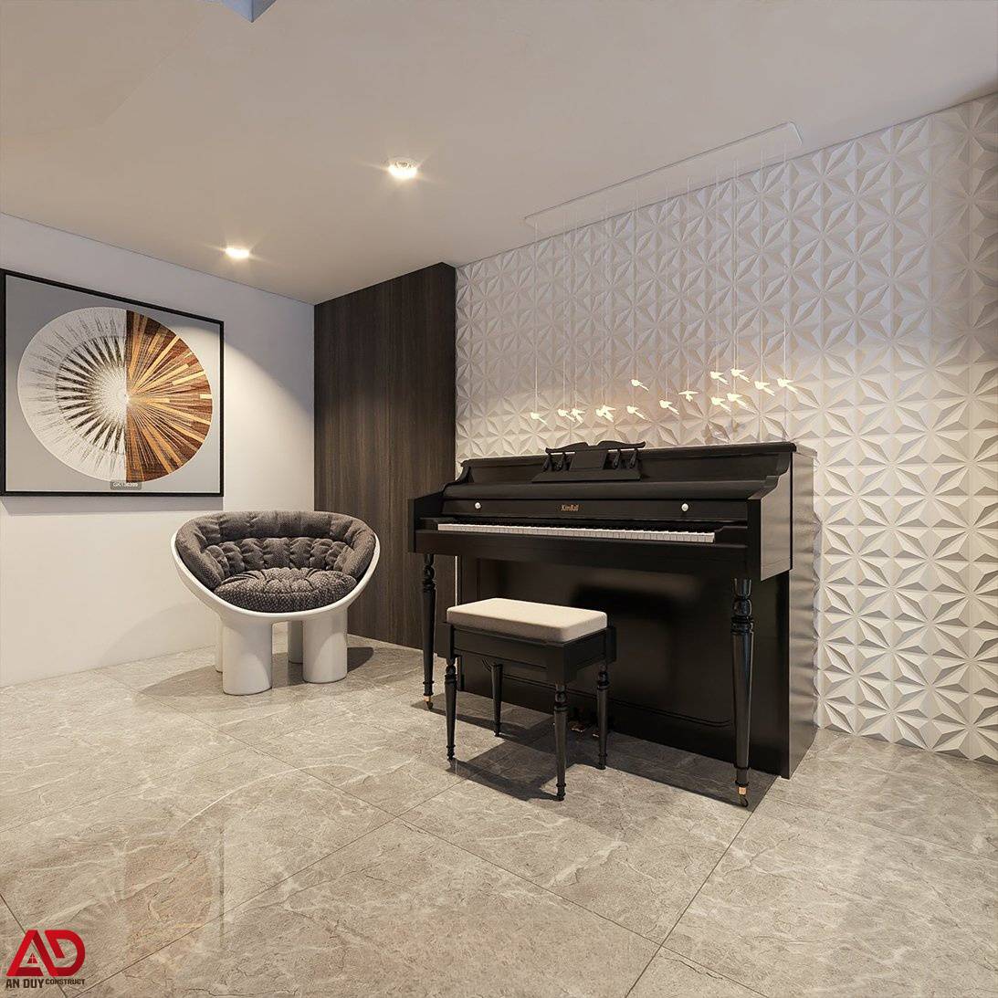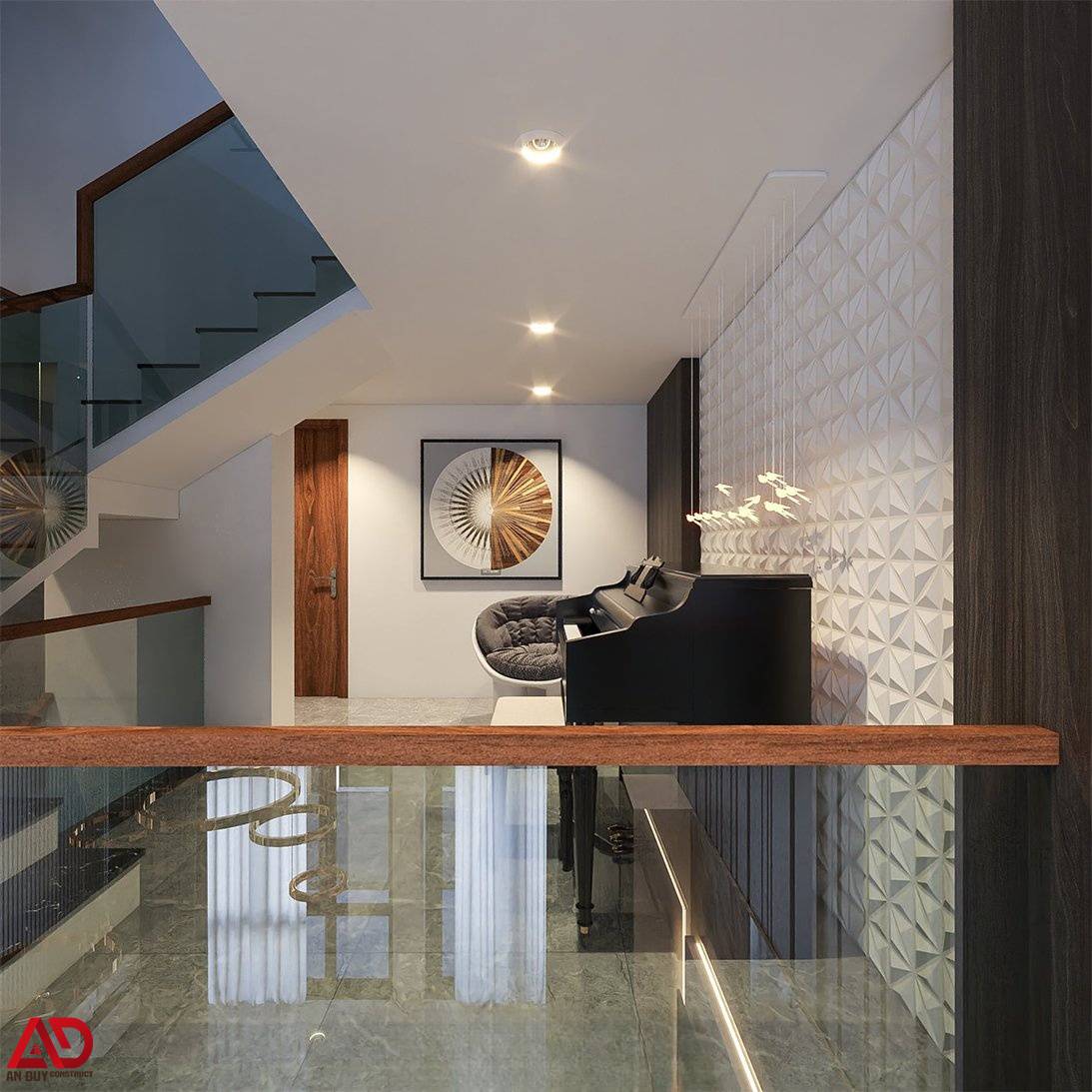 Một điểm thú vị trong công trình là khu vực sảnh tầng trên được tận dụng làm góc piano thư giãn. Tường trang trí 3D màu sáng kết hợp đèn thả nghệ thuật tạo nên một góc nhìn nhẹ nhàng, tinh tế, góp phần nâng cao giá trị sống tinh thần cho gia chủ.