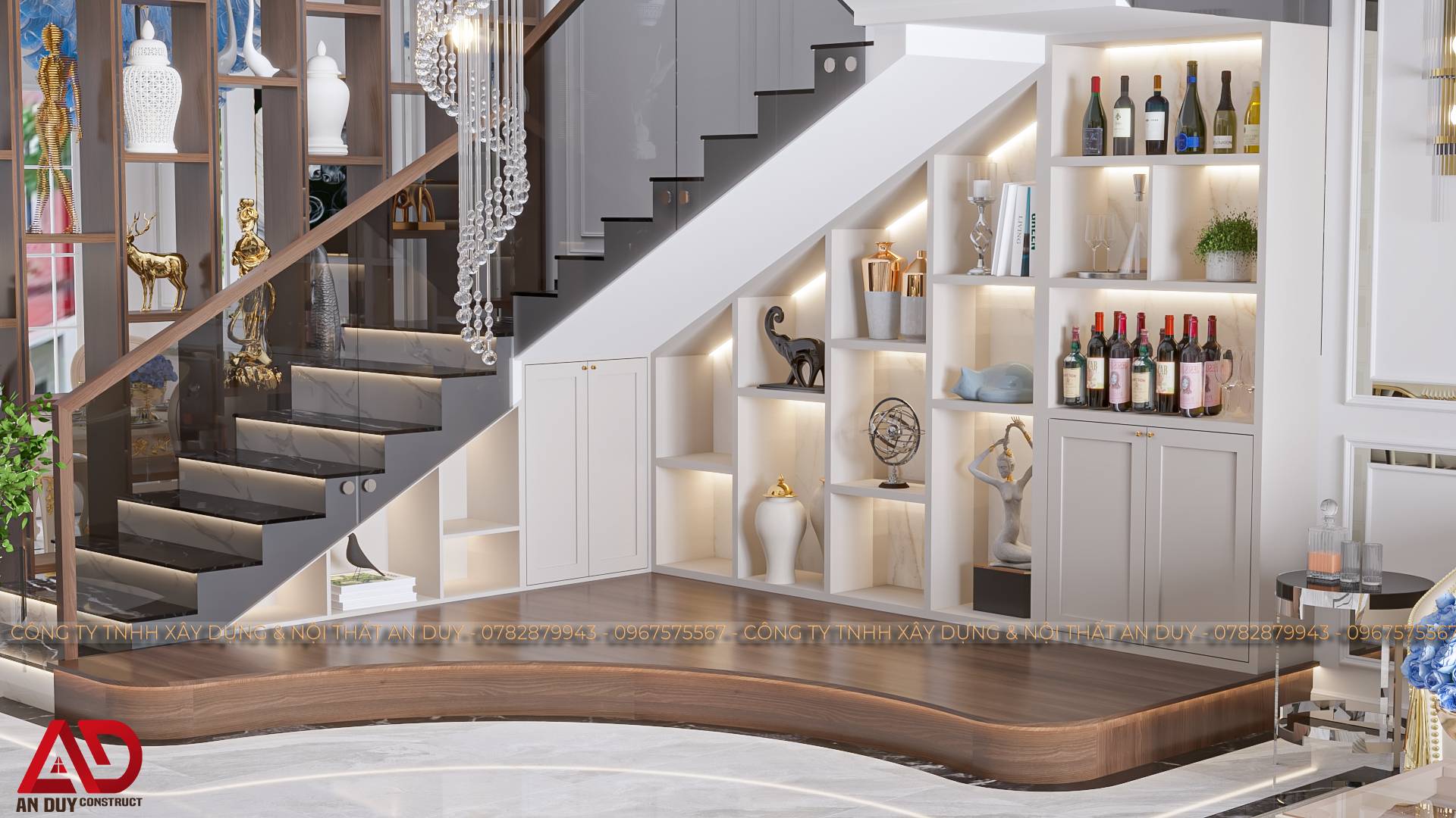 Dưới gầm cầu thang, đội ngũ thiết kế của An Duy khéo léo bố trí thêm hệ tủ và kệ mở. Cách làm này giúp tận dụng diện tích tối đa, đồng thời mang lại cảm giác gọn gàng, có chiều sâu. Với nhà phố, giải pháp này đặc biệt hiệu quả vì vừa tiết kiệm không gian vừa tăng thêm giá trị thẩm mỹ cho tổng thể.