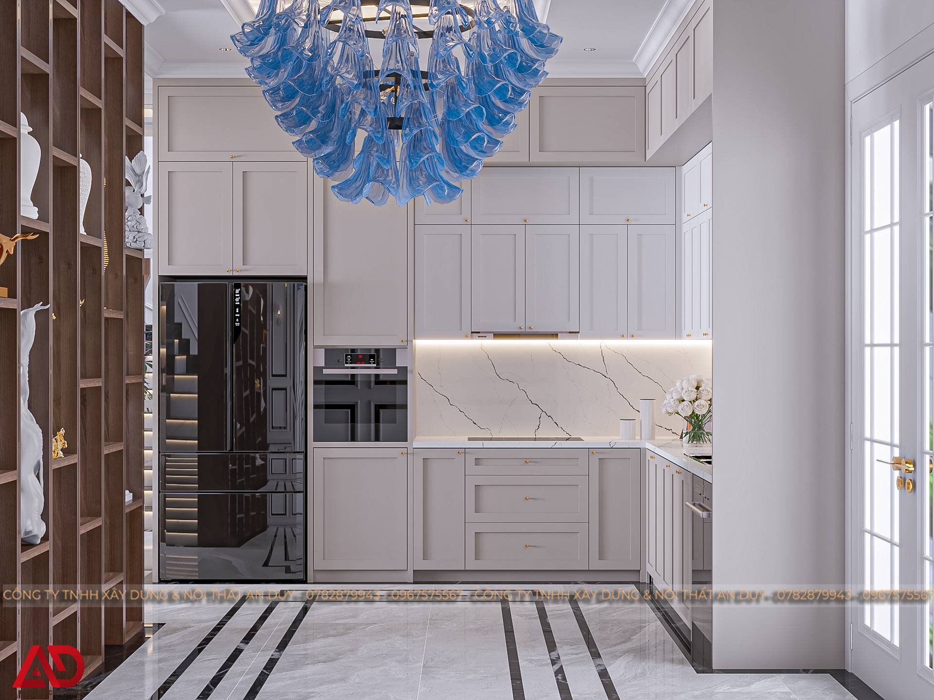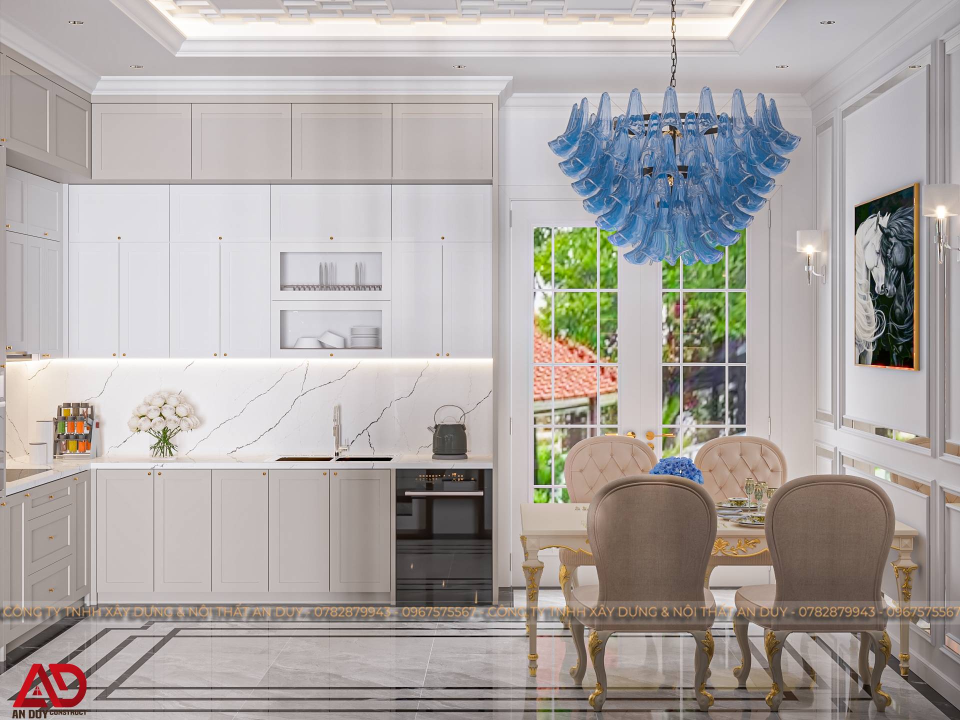 Khu vực bếp sử dụng hệ tủ kịch trần màu trắng, kết hợp mặt đá vân mây sang trọng tạo cảm giác sạch sẽ, rộng rãi và cao cấp. Cách bố trí tủ bếp thông minh giúp tối ưu khả năng lưu trữ, đáp ứng nhu cầu sử dụng hàng ngày của gia đình. Thiết bị bếp âm tủ hiện đại mang lại sự gọn gàng và đồng bộ cho toàn bộ không gian.