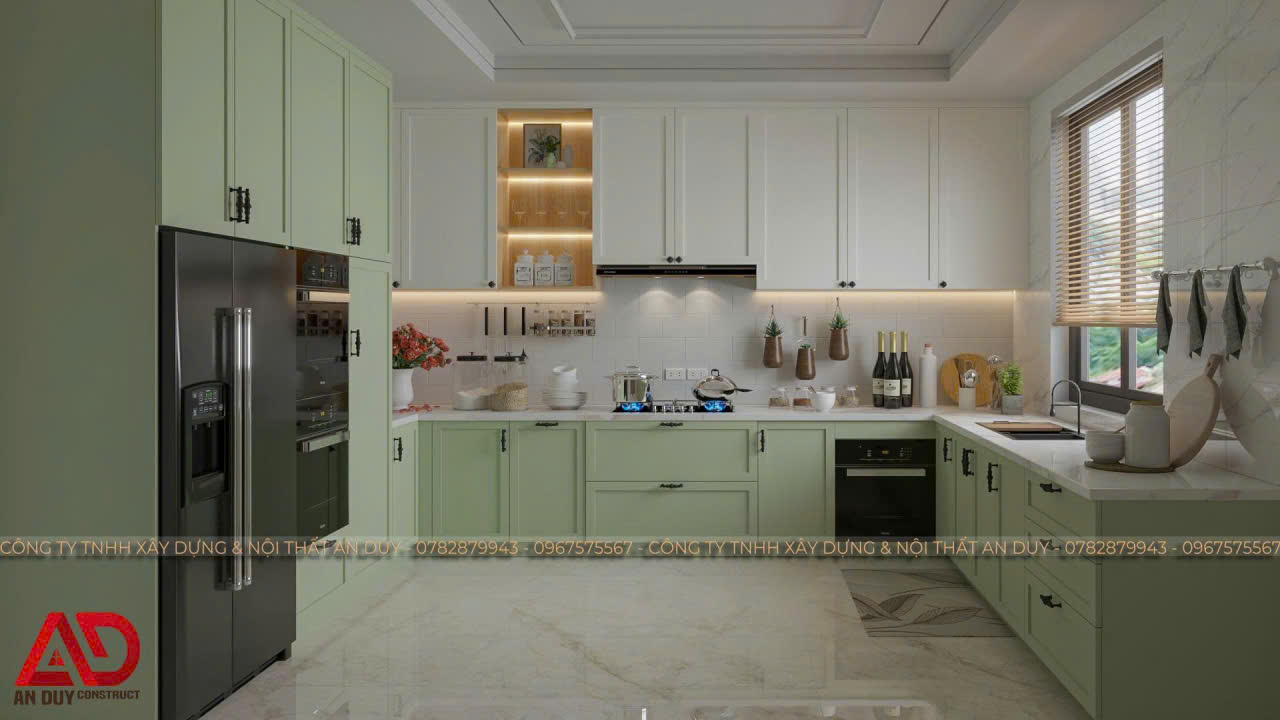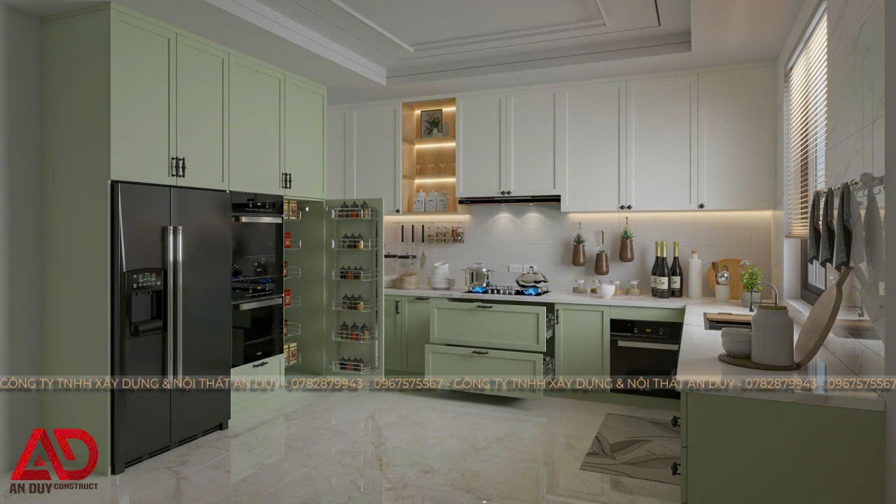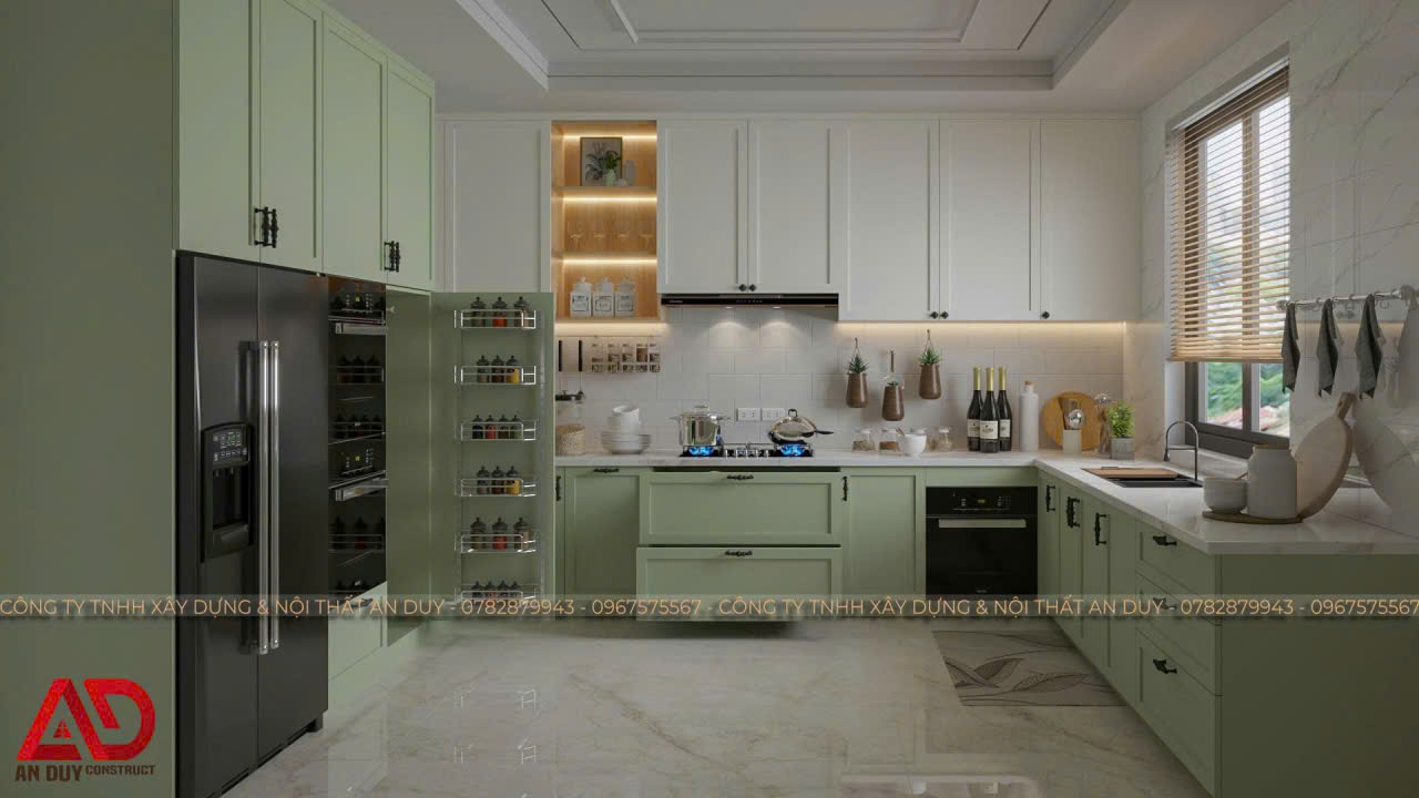 Một điểm rất nổi bật trong các mẫu thiết kế nội thất phòng bếp hiện đại của An Duy là khả năng phối màu linh hoạt theo nhiều phong cách khác nhau. Từ gam xanh olive nhẹ nhàng kết hợp trắng kem, đến tông trắng xám hiện đại, hoặc sắc kem kết hợp kính ốp bếp xanh, mỗi mẫu đều mang đến một cảm xúc riêng và phù hợp với từng gu thẩm mỹ khác nhau.