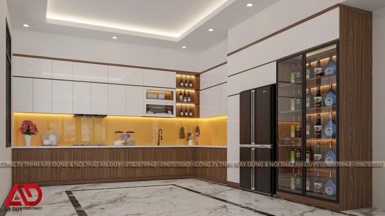 Trong nhiều mẫu bếp của An Duy, hệ tủ kính trang trí kết hợp đèn led được sử dụng như một điểm nhấn đắt giá. Phần tủ rượu, kệ trưng bày và ánh sáng hắt không chỉ làm không gian thêm nổi bật mà còn góp phần tạo cảm giác cao cấp, hiện đại.