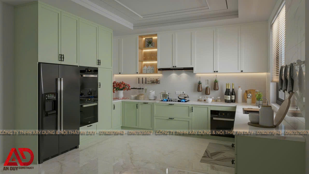 Một ưu điểm nổi bật trong các mẫu thiết kế nội thất phòng bếp đẹp của An Duy là sự linh hoạt về màu sắc. Từ tông trắng kết hợp vân gỗ sang trọng, trắng phối kính vàng ấm áp, xám hiện đại, xanh pastel trẻ trung đến xanh olive thanh lịch, mỗi mẫu đều mang một cá tính riêng.